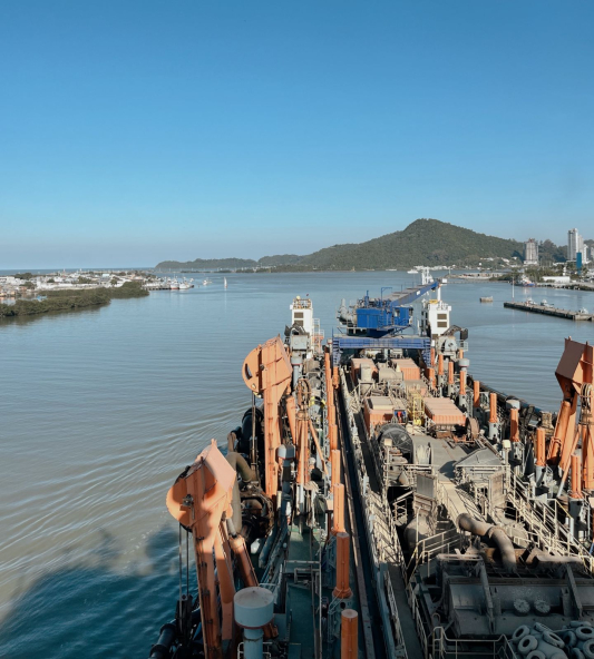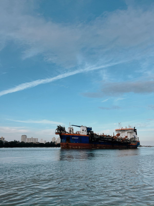 A embarcação realiza serviços de dragagem no canal de acesso ao complexo portuário, operação considerada o maior contrato em andamento e essencial para a manutenção das atividades.